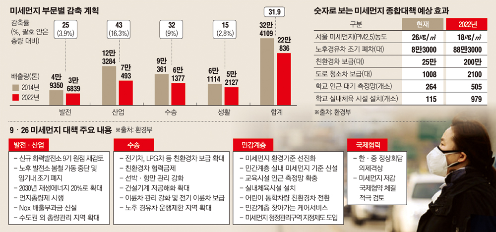 정부는 26일 국무회의에서 환경부 등 12개 관계부처 합동 '미세먼지 관리 종합대책'을 확정하고, 2022년까지 이러한 내용을 골자로 하는 로드맵을 발표했다.