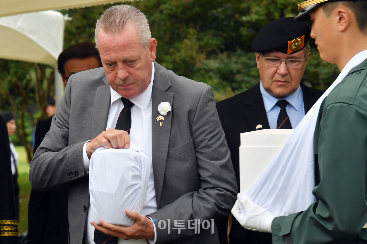27일 부산 남구 유엔기념공원에서 열린 6.25전쟁 네덜란드 참전용사 고(故) 요한 테오도르 알데베렐트 씨의 유해 안장식에서 유족대표인 로널드 반빌렛 씨가 유골함을 안치하고 있다. 고 알데베렐트씨는 네덜란드 참전협회에 자신의 유해를 동료들이 잠들어 있는 대한민국 땅에 묻어달라는 유언을 남긴 채 지난 2월 4일 향년 88세로 세상을 떠났다. 이동근 기자 foto@
