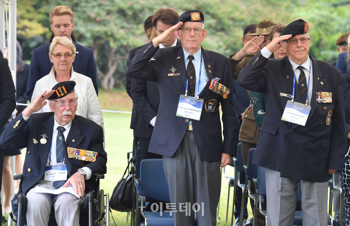 27일 부산 남구 유엔기념공원에서 열린 6.25전쟁 네덜란드 참전용사 고(故) 요한 테오도르 알데베렐트 씨의 유해 안장식에서 참전용사들이 고인을 향해 경례하고 있다. 고 알데베렐트씨는 네덜란드 참전협회에 자신의 유해를 동료들이 잠들어 있는 대한민국 땅에 묻어달라는 유언을 남긴 채 지난 2월 4일 향년 88세로 세상을 떠났다. 이동근 기자 foto@