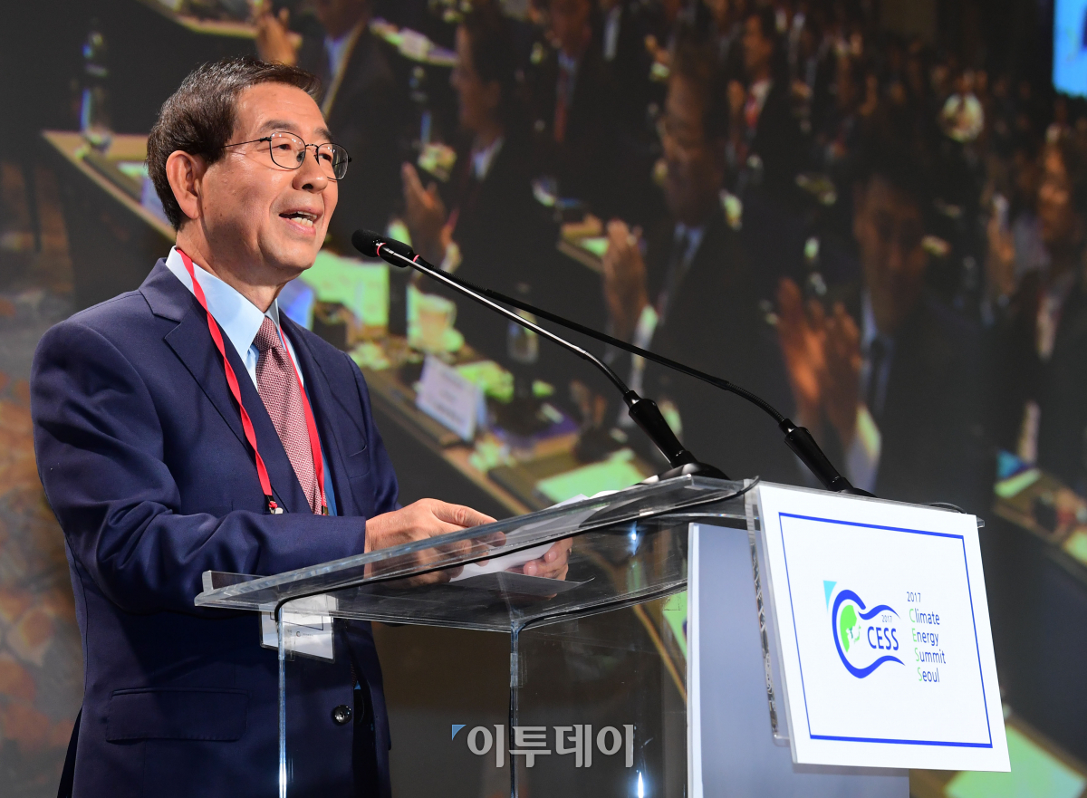 경제신문 이투데이와 (재)기후변화센터가 주최하는 서울 기후-에너지 회의 2017이 28일 서울 종로구 포시즌스호텔에서 열린 가운데 박원순 서울시장이 축사를 하고 있다. 국내 처음으로 열리는 이번 회의는 기후변화와 4차산업혁명 시대 에너지 전환 전략' 등을 주제로 전문가를 초청해 신기후 체제에서의 우리의 노력과 역할을 알아보는 자리다. 고이란 기자 photoeran@