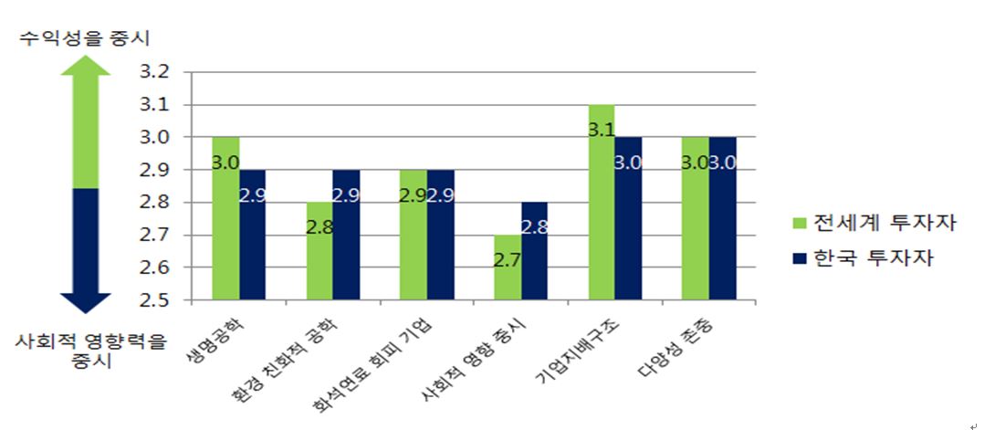 또 한국 투자자들은 SRI와 관련해 수익성에 대한 기대보다 사회에 미치는 영향력을 먼저 생각하는 것으로 조사됐다. 한국 투자자들의 응답 평균은 2.9이다. 1은 사회적 책임, 5는 수익성을 중시하는 경향을 의미한다. 반면 전세계 투자자들은 SRI의 목적으로 수익성을 꼽는 비중이 한국 투자자들을 앞질렀다.