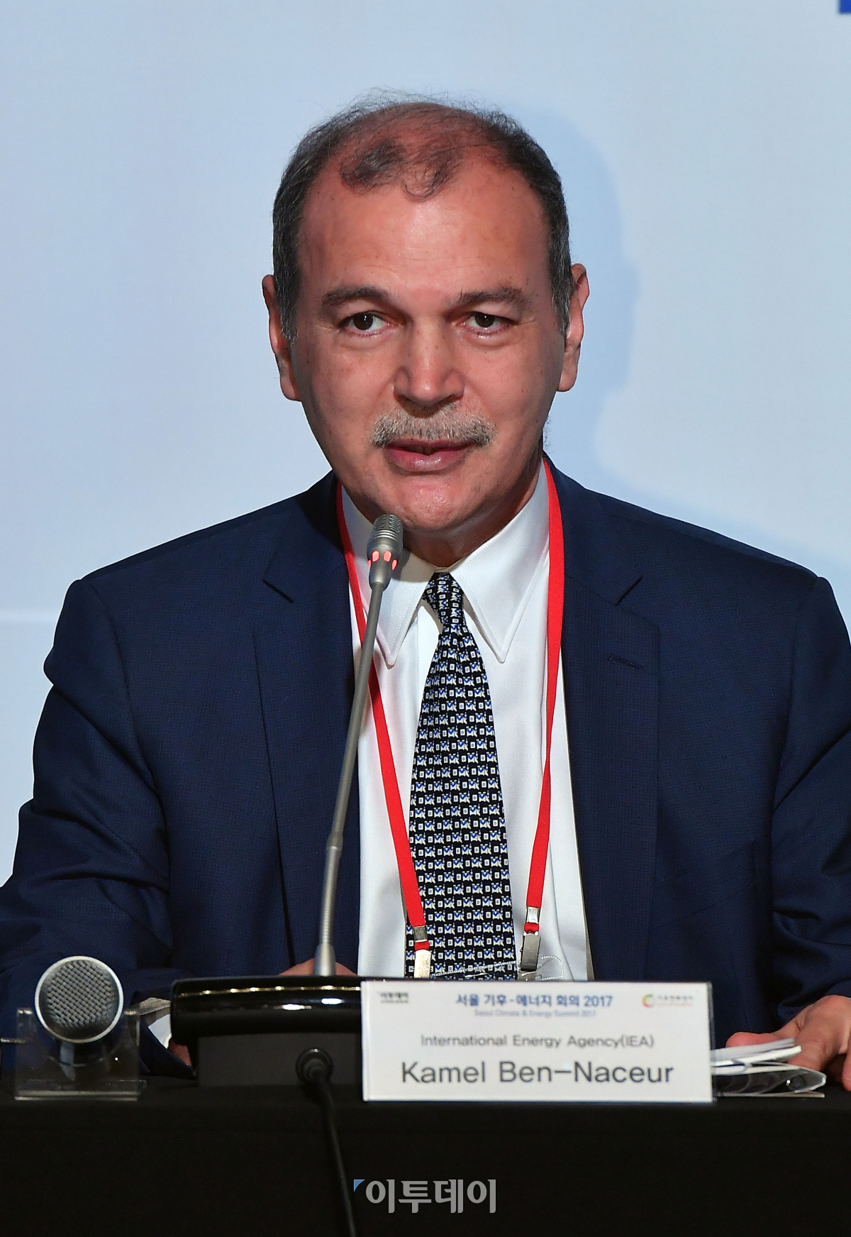 캐멀 벤 나세르 국제에너지기구 전 실장이 28일 서울 종로구 포시즌스호텔에서 열린 서울 기후-에너지 회의 2017에서 제1회의 '새로운 기후경제시대의 위험성과 기회'를 진행하고 있다. 이동근 기자 foto@