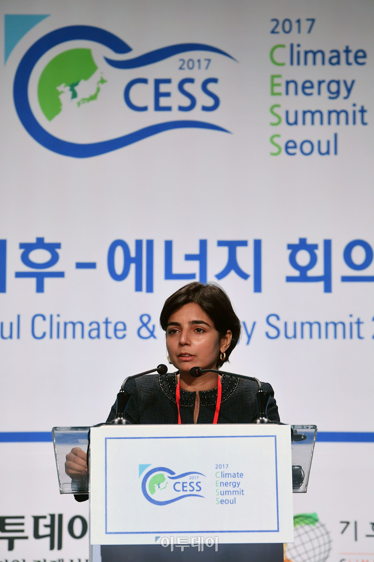 마후아 아차리아 글로벌녹색성장연구소 사무차장이 28일 서울 종로구 포시즌스호텔에서 열린 서울 기후-에너지 회의 2017에서 '기후금융'을 주제로 발표하고 있다. 이동근 기자 foto@