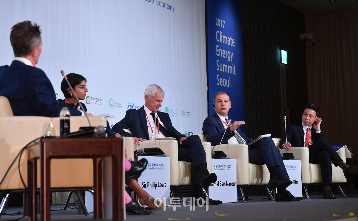 캐멀 벤 나세르(오른쪽에서 두 번째) 국제에너지기구 전 실장이 28일 서울 종로구 포시즌스호텔에서 열린 서울 기후-에너지 회의 2017에서 '지속가능한 기후경제체제 모색'을 주제로 한 패널토론에 참석해 발언하고 있다. 이동근 기자 foto@