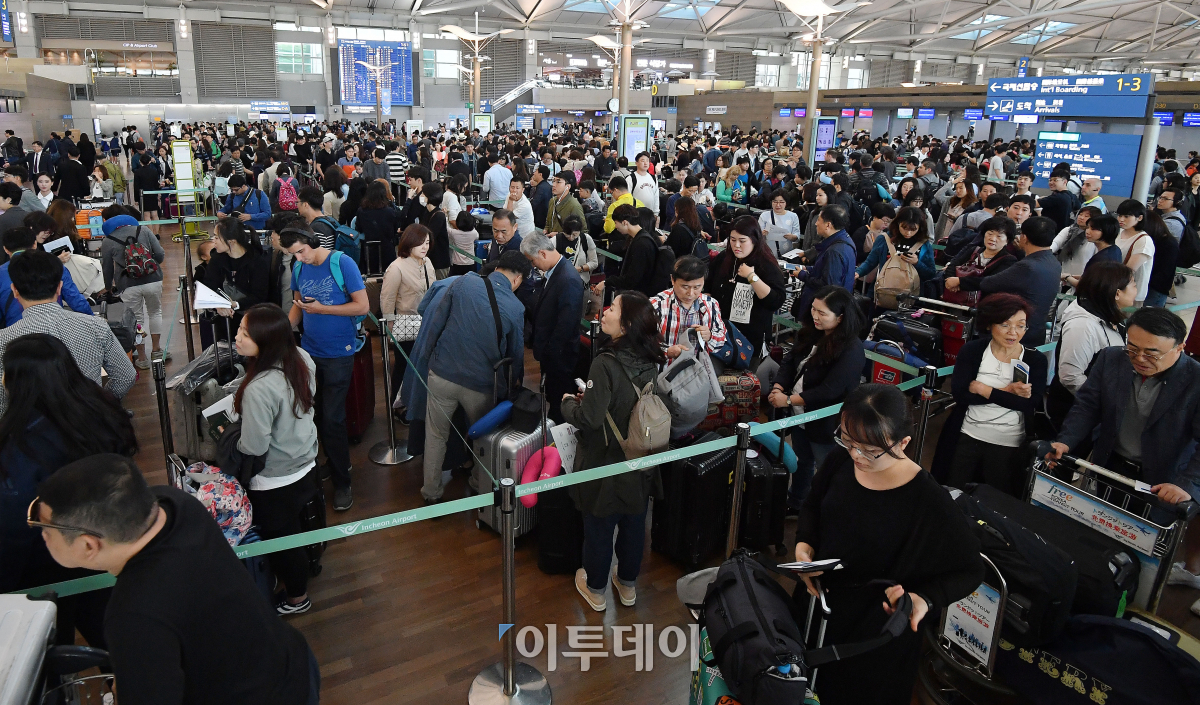 최장 열흘 간의 황금연휴를 하루 앞둔 29일 오전 인천국제공항 출국장이 여행객들로 북적이고 있다. 인천국제공항공사는 이번 연휴기간 공항을 이용하는 이용객은 195만 명, 출국객은 97만명으로 역대 명절연휴 최다치를 기록할 것으로 예측했다. 이동근 기자 foto@