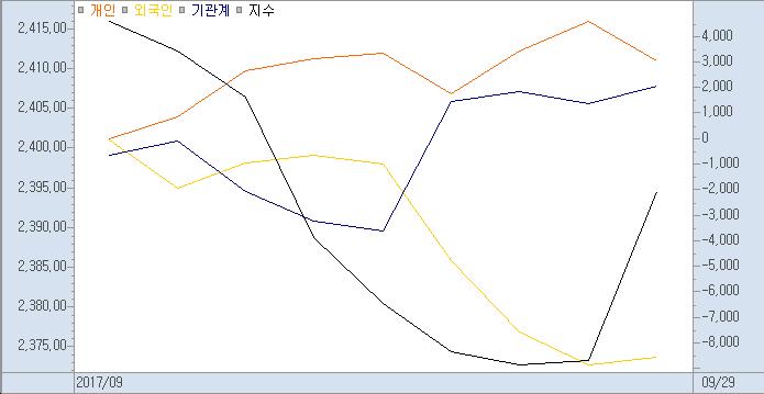 30일 한국거래소에 따르면 코스피는 19일부터 27일까지 7거래일 연속 하락해 2370선까지 주저앉았다. 코스피가 종가 기준 7거래일 연속 하락한 것은 2014년(9월 25일~10월 6일) 이후 3년 여 만이다. 지난 28일부터 이틀간 오르며 2390선을 회복한 게 그나마 위안이 됐다.
