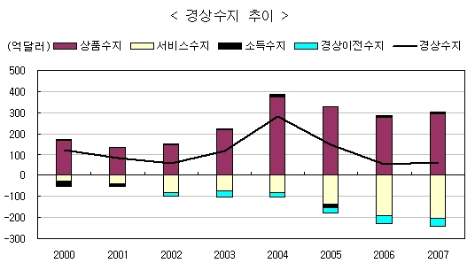 상품수지는 유가 등 국제원자재가격의 상승에도 불구하고 수출이 14.1% 증가하는 견조한 증가세에 힘입어 흑자규모가 전년보다 15억달러 확대된 294억1000만달러의 흑자를 나타냈다.