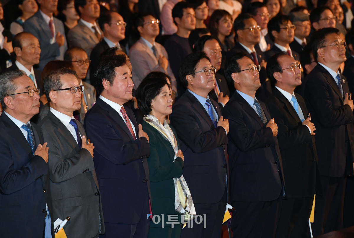 이낙연(앞줄 왼쪽에서 세 번째) 국무총리가 9일 서울 종로구 세종문화회관에서 열린 제571돌 한글날 경축식에서 참석자들과 국민의례를 하고 있다.왼쪽부터 김종택 한글학회 이사장, 권재일 한글학회장, 이 총리, 추미애 더불어민주당 대표, 우원식 원내대표. 주호영 바른정당 원내대표, 노회찬 정의당 원내대표, 송영길 의원. 이동근 기자 foto@
