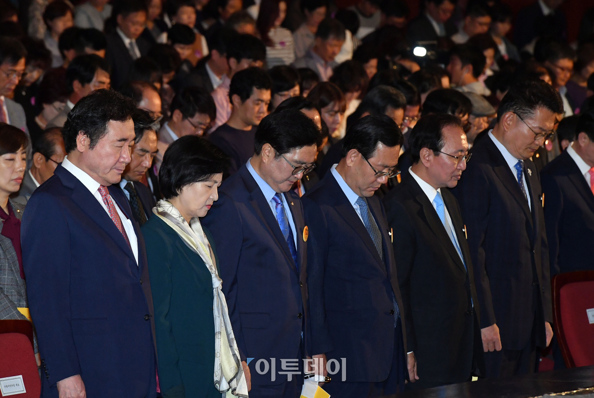 이낙연 국무총리, 추미애 더불어민주당 대표, 우원식 원내대표, 주호영 바른정당 원내대표, 노회찬 정의당 원내대표, 송영길 의원(왼쪽부터)이 9일 서울 종로구 세종문화회관에서 열린 제571돌 한글날 경축식에서 묵념을 하고 있다. 이동근 기자 foto@