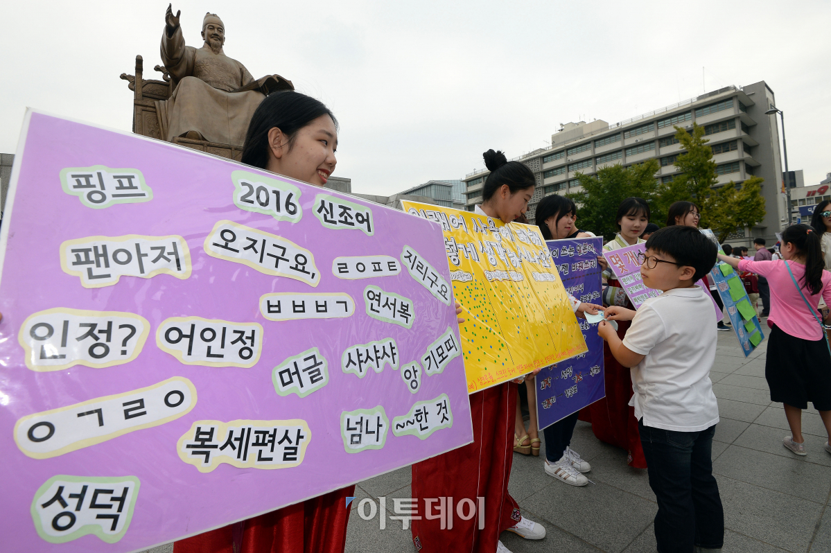 제571돌 한글날인 9일 서울 광화문광장에서 열린 한글문화큰잔치를 찾은 학생들이 올바른 한글을 알리고 있다. 이동근 기자 foto@