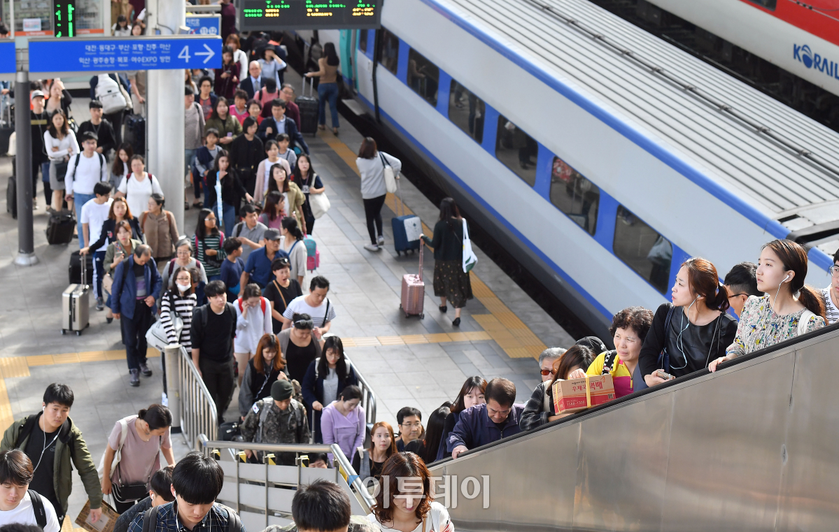 추석연휴 마지막 날인 9일 서울역에 도착한 귀경객들이 열차에서 내려 집으로 향하고 있다. 이동근 기자 foto@