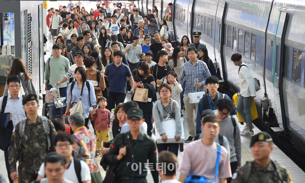 추석연휴 마지막 날인 9일 서울역에 도착한 귀경객들이 열차에서 내려 집으로 향하고 있다. 이동근 기자 foto@