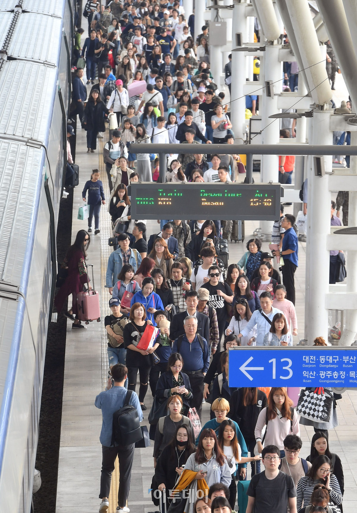 추석연휴 마지막 날인 9일 서울역에 도착한 귀경객들이 열차에서 내려 집으로 향하고 있다. 이동근 기자 foto@