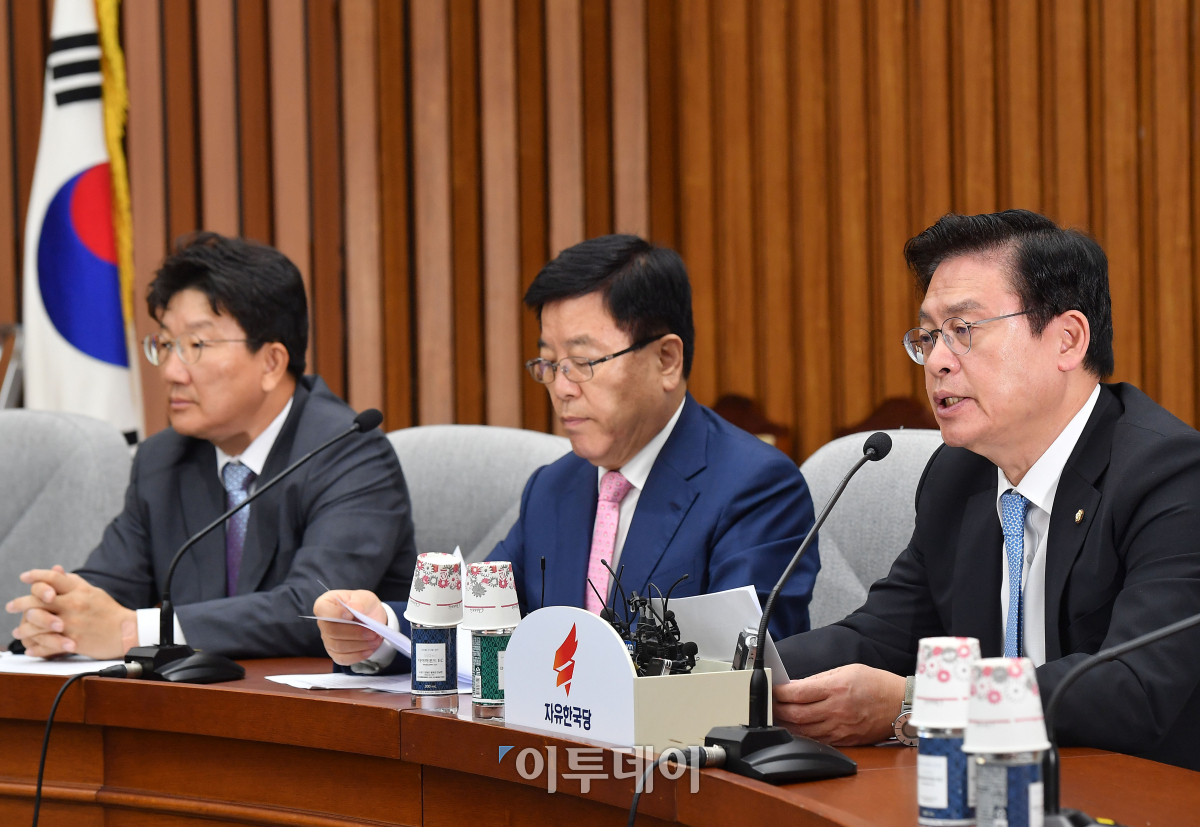정우택(오른쪽) 자유한국당 원내대표가 10일 오전 서울 여의도 국회에서 열린 국정감사대책회의에서 모두발언을 하고 있다. 이동근 기자 foto@