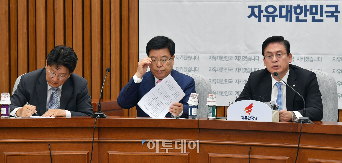 정우택(오른쪽) 자유한국당 원내대표가 10일 오전 서울 여의도 국회에서 열린 국정감사대책회의에서 모두발언을 하고 있다. 이동근 기자 foto@