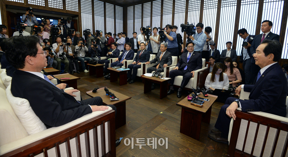 정세균(오른쪽) 국회의장이 10일 서울 여의도 국회에서 열린 여야4당 원내대표 정례회동에서 인사말을 하고 있다. 이동근 기자 foto@