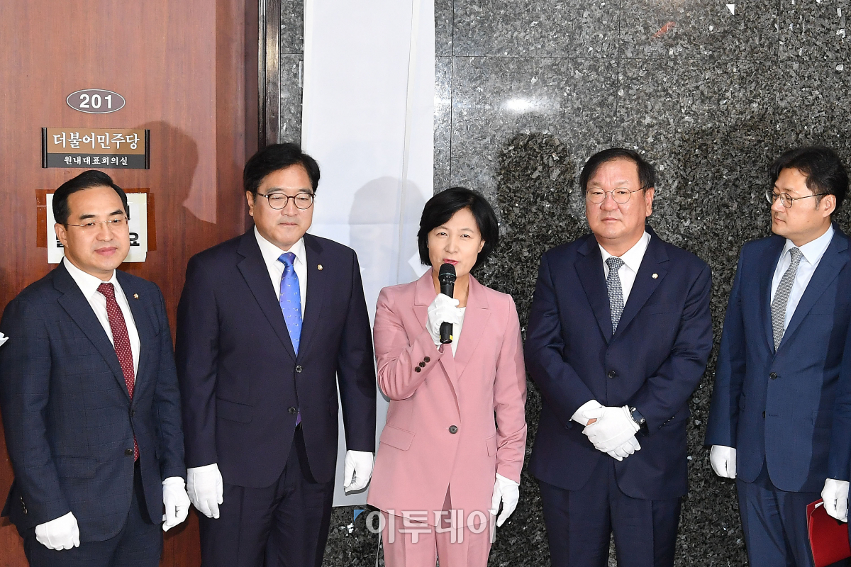 추미애(가운데) 더불어민주당 대표가 10일 오전 서울 여의도 국회 원내대표회의실에 마련된 국정감사 종합상황실 현판 제막에 앞서 인사말을 하고 있다. 이동근 기자 foto@