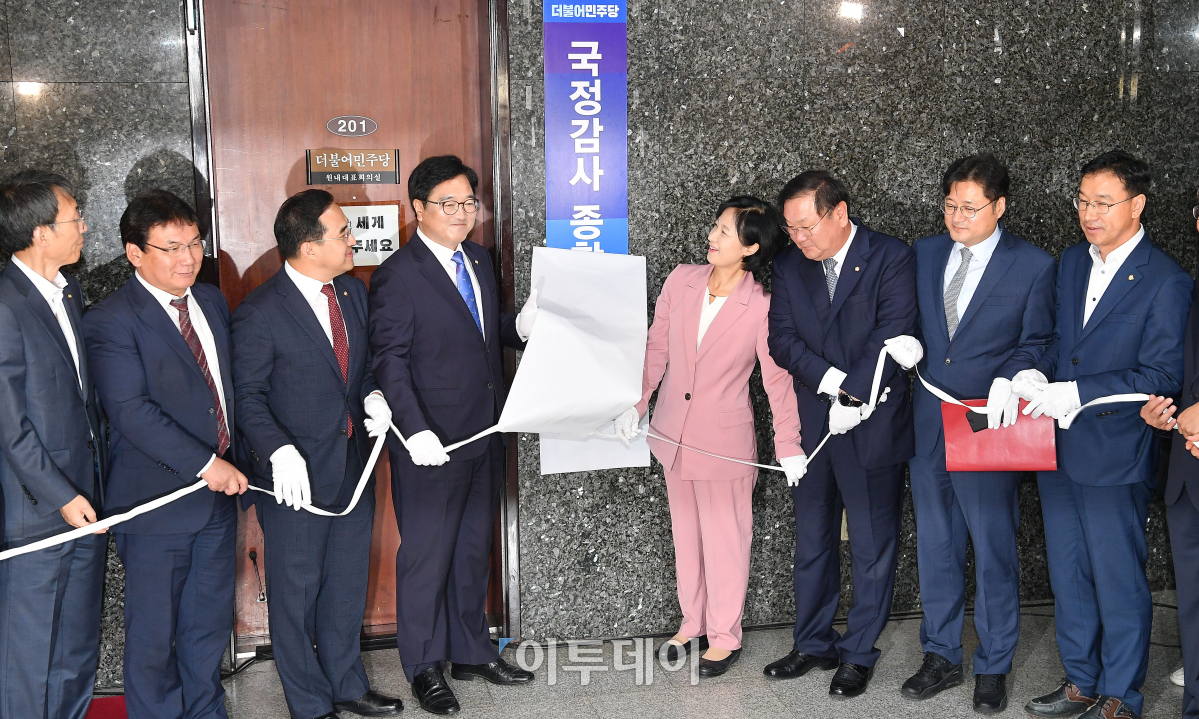 추미애(오른쪽에서 네 번째) 더불어민주당 대표, 우원식(오른쪽에서 다섯 번째) 원내대표를 비롯한 당 지도부들이 10일 오전 서울 여의도 국회 원내대표회의실에 마련된 국정감사 종합상황실 현판을 제막을 하고 있다. 이동근 기자 foto@