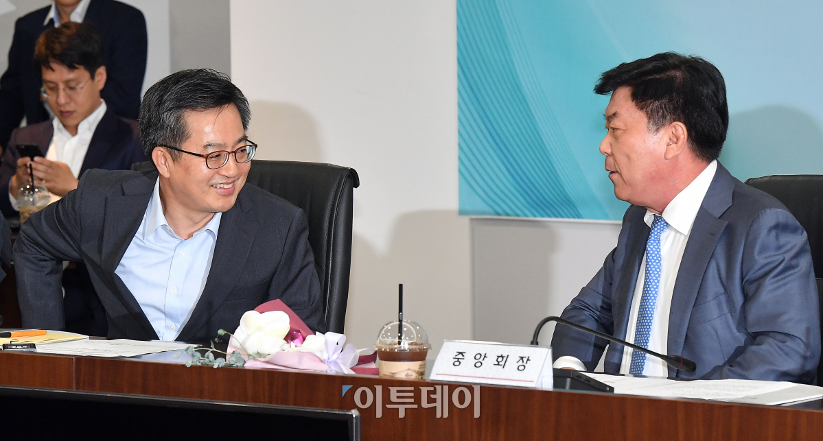 김동연(왼쪽) 경제부총리 겸 기획재정부 장관이 10일 서울 여의도 중소기업중앙회에서 열린 중소기업인 간담회에서 박성택 중기중앙회 회장과 대화하고 있다. 이동근 기자 foto@