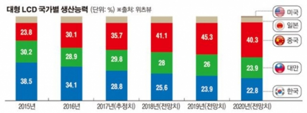 LCD에만 5000억 위안(약 86조 원)을 투자한 중국은 올해부터 대형 LCD 시장서 한국을 꺾고 1위를 차지할 전망이다. 대만시장조사기관 위츠뷰는 올해 중국의 대형 LCD 패널 생산 비중이 35.7%를 기록해 사상 첫 1위에 올라설 것이라고 밝혔다. 이어 2위는 대만(29.8%), 3위는 한국(28.8%)이 차지할 것으로 전망했다. 1위 자리를 지켜온 한국은 중국과 대만에 밀려 3위까지 순위가 내려갔다.