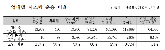 반면 온라인 쇼핑몰과 중소유통매장 등의 도입률은 각각 0.14%, 14%에 그쳤다. 식자재유통 매장과 SSM(기업형 슈퍼마켓)형 매장도 각각 25%, 33%에 불과했다.