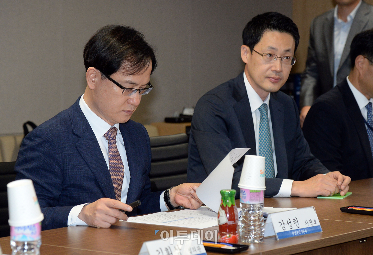 강성천(왼쪽) 산업통상자원부 통상차관보가 11일 서울 중구 한국산업기술평가관리원에서 미국 세탁기 세이프가드관련 대책회의에서 자료를 살펴보고 있다. 이동근 기자 foto@