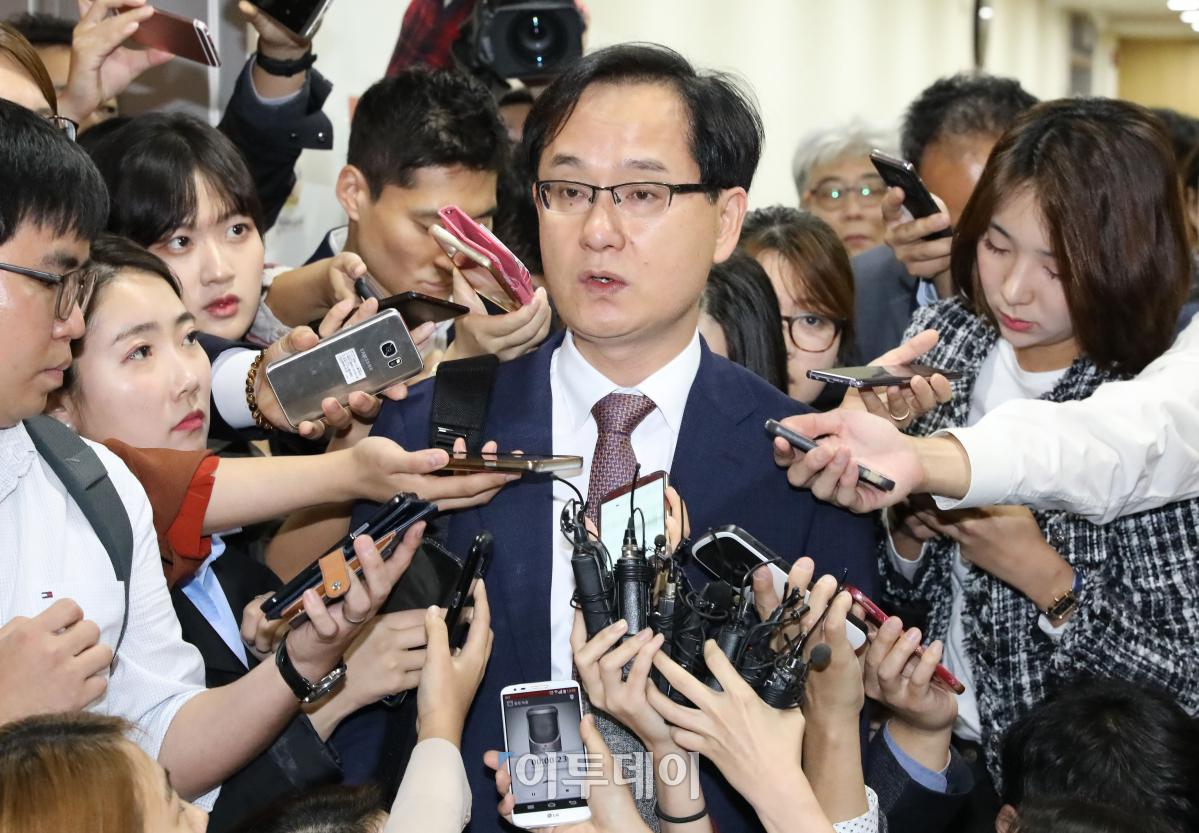 강성천 산업통상자원부 통상차관보가 11일 서울 중구 한국산업기술평가관리원에서 미국 세탁기 세이프가드관련 대책회의를 주재하기 전 취재진의 질문에 답하고 있다. 이동근 기자 foto@