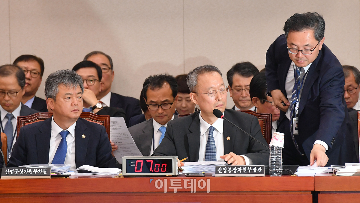 백운규 산업통상자원부 장관이 12일 서울 여의도 국회에서 열린 산업통상자원부 에너지분야 국정감사에서 관계자로부터 자료를 전달받고 있다. 이동근 기자 foto@