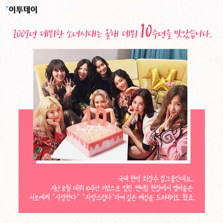 2007년 데뷔한 소녀시대는 올해 데뷔 10주년을 맞았습니다.국내 현역 최장수 걸그룹인데요. 지난 8월 데뷔 10주년 기념으로 열린 팬미팅 현장에서 멤버들은 서로에게 “사랑한다” “자랑스럽다”라며 깊은 애정을 드러내기도 했죠.