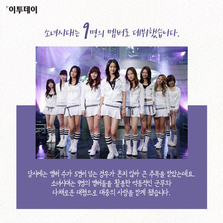 소녀시대는 9명의 멤버로 데뷔했습니다.당시에는 멤버 수가 5명이 넘는 경우가 흔치 않아 큰 주목을 받았는데요. 소녀시대는 9명의 멤버들을 활용한 역동적인 군무와 다채로운 대형으로 대중의 사랑을 받게 됐습니다.