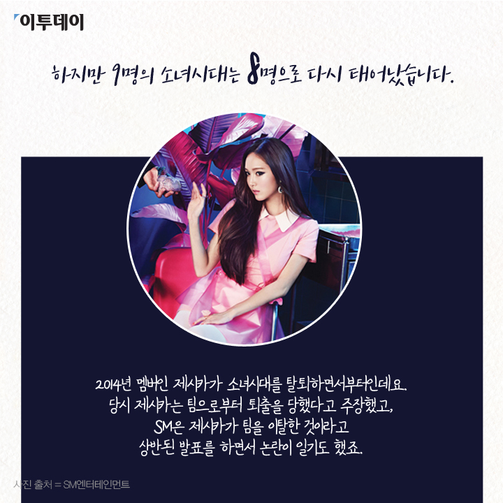 하지만 9명의 소녀시대는 8명으로 다시 태어났습니다.2014년 멤버인 제시카가 소녀시대를 탈퇴하면서부터인데요. 당시 제시카는 팀으로부터 퇴출을 당했다고 주장했고, SM은 제시카가 팀을 이탈한 것이라고 상반된 발표를 하면서 논란이 일기도 했죠.