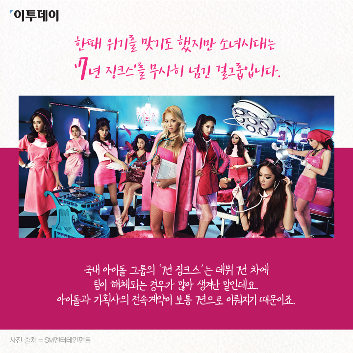 한때 위기를 맞기도 했지만 소녀시대는 ‘7년 징크스’를 무사히 넘긴 걸그룹입니다.국내 아이돌 그룹의 ‘7년 징크스’는 데뷔 7년 차에 팀이 해체되는 경우가 많아 생겨난 말인데요. 아이돌과 기획사의 전속계약이 보통 7년으로 이뤄지기 때문이죠.