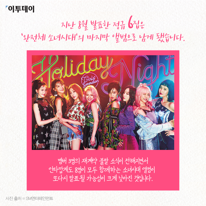 지난 8월 발표한 정규 6집은 ‘완전체 소녀시대’의 마지막 앨범으로 남게 됐습니다.멤버 3명의 재계약 불발 소식이 전해지면서 안타깝게도 8명이 모두 함께하는 소녀시대 앨범이 또다시 발표될 가능성이 크게 낮아진 것입니다.