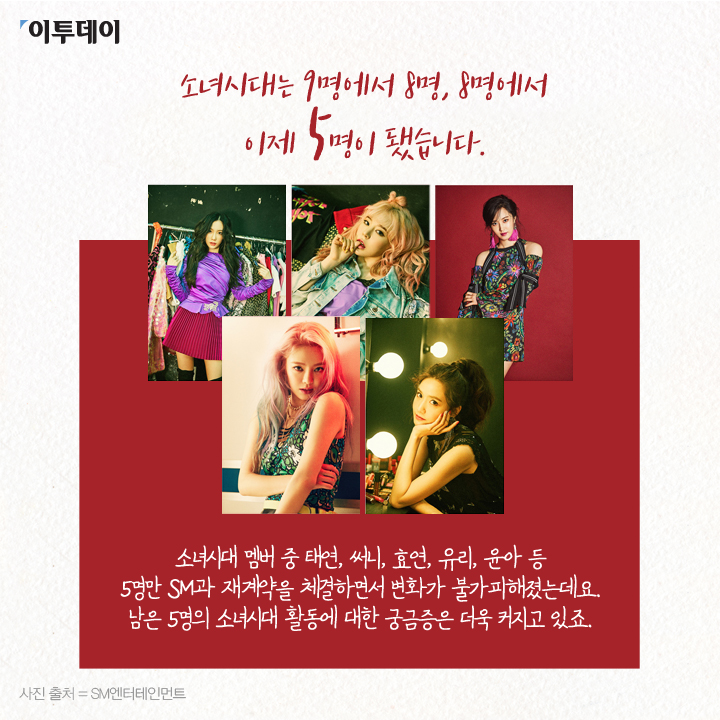 소녀시대는 9명에서 8명, 8명에서 이제 5명이 됐습니다.소녀시대 멤버 중 태연, 써니, 효연, 유리, 윤아 등 5명만 SM과 재계약을 체결하면서 변화가 불가피해졌는데요. 남은 5명의 소녀시대 활동에 대한 궁금증은 더욱 커지고 있죠.