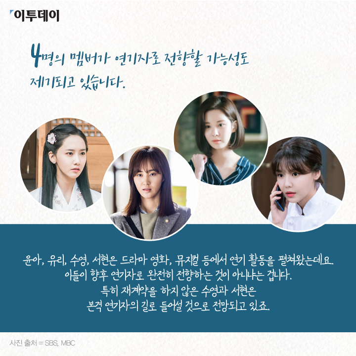 4명의 멤버가 연기자로 전향할 가능성도 제기되고 있습니다.윤아, 유리, 수영, 서현은 드라마 영화, 뮤지컬 등에서 연기 활동을 펼쳐왔는데요. 이들이 향후 연기자로 완전히 전향하는 것이 아니냐는 겁니다. 특히 재계약을 하지 않은 수영과 서현은 본격 연기자의 길로 들어설 것으로 전망되고 있죠.