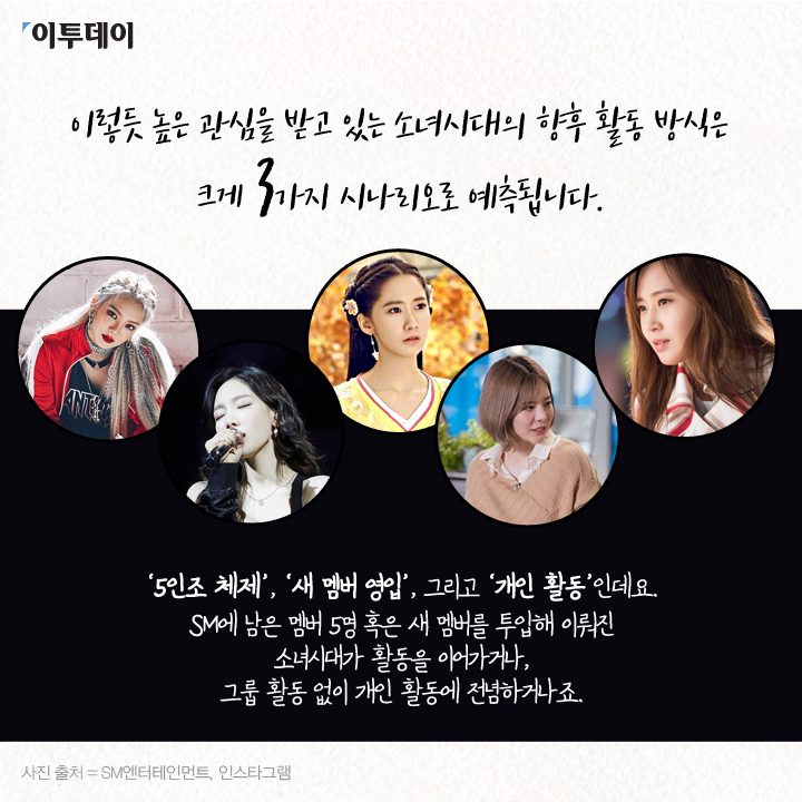 이렇듯 높은 관심을 받고 있는 소녀시대의 향후 활동 방식은 크게 3가지 시나리오로 예측됩니다.‘5인조 체제’, ‘새 멤버 영입’, 그리고 ‘개인 활동’인데요. SM에 남은 멤버 5명 혹은 새 멤버를 투입해 이뤄진 소녀시대가 활동을 이어가거나, 그룹 활동 없이 개인 활동에 전념하거나죠.