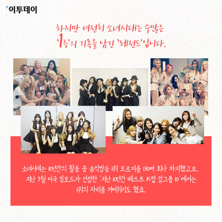 하지만 여전히 소녀시대는 수많은 ‘1등’의 기록을 남긴 ‘레전드’입니다.소녀시대는 10년간의 활동 중 음악방송 1위 트로피를 130여 회나 차지했고요. 지난 7월 미국 빌보드가 선정한 ‘지난 10년간 베스트 K팝 걸그룹 10’에서는 1위의 자리를 거머쥐기도 했죠.