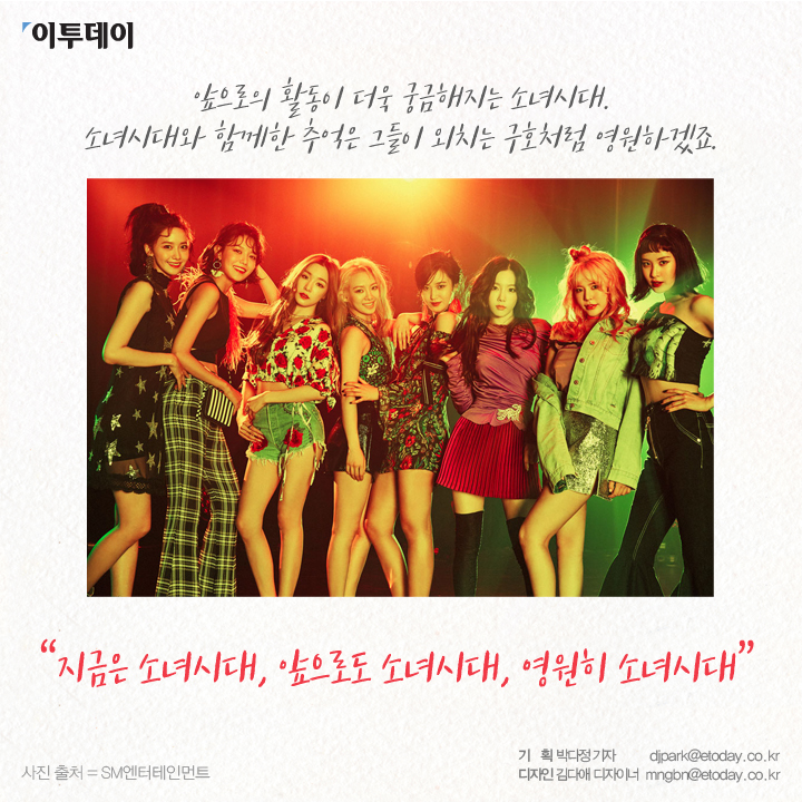 앞으로의 활동이 더욱 궁금해지는 소녀시대.소녀시대와 함께한 추억은 그들이 외치는 구호처럼 영원하겠죠.