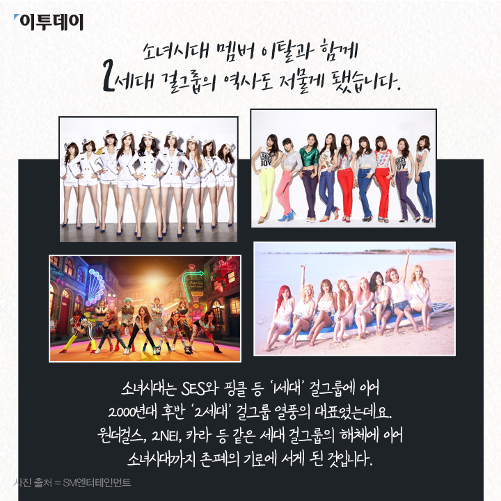 소녀시대 멤버 이탈과 함께 2세대 걸그룹의 역사도 저물게 됐습니다.소녀시대는 SES와 핑클 등 ‘1세대’ 걸그룹에 이어 2000년대 후반 ‘2세대’ 걸그룹 열풍의 대표였는데요. 원더걸스, 2NE1, 카라 등 같은 세대 걸그룹의 해체에 이어 소녀시대까지 존폐의 기로에 서게 된 것입니다.