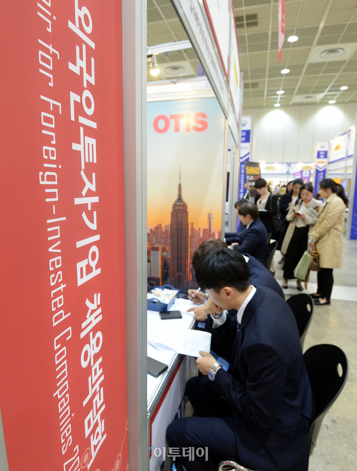 제12회 외국인투자기업 채용박람회가 12일 서울 강남구 코엑스에서 열린 가운데 구직자들이 채용상담을 받고 있다. 지멘스, 한국쓰리엠 등 '포춘지' 선정 500대 세계적 기업 31개 사를 포함해 외국인 투자기업 136개사가 참가한 이번박람회는 채용설명회와 현장 면접을 통해 약 500명을 채용할 계획이다. 이동근 기자 foto@