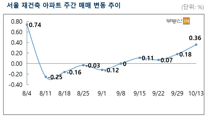 14일 부동산114에 따르면 이달 둘째 주 서울 재건축 아파트값은 0.36% 올라 상승폭이 다시 커졌다. 8.2 대책 이후 최대 상승폭을 보인 추석 직전의 0.18% 상승보다 두배 가량 높은 모습이다. 둔촌주공과 개포주공1단지 등 주요 재건축 아파트가 가격 상승을 이끌었다는 분석이다.