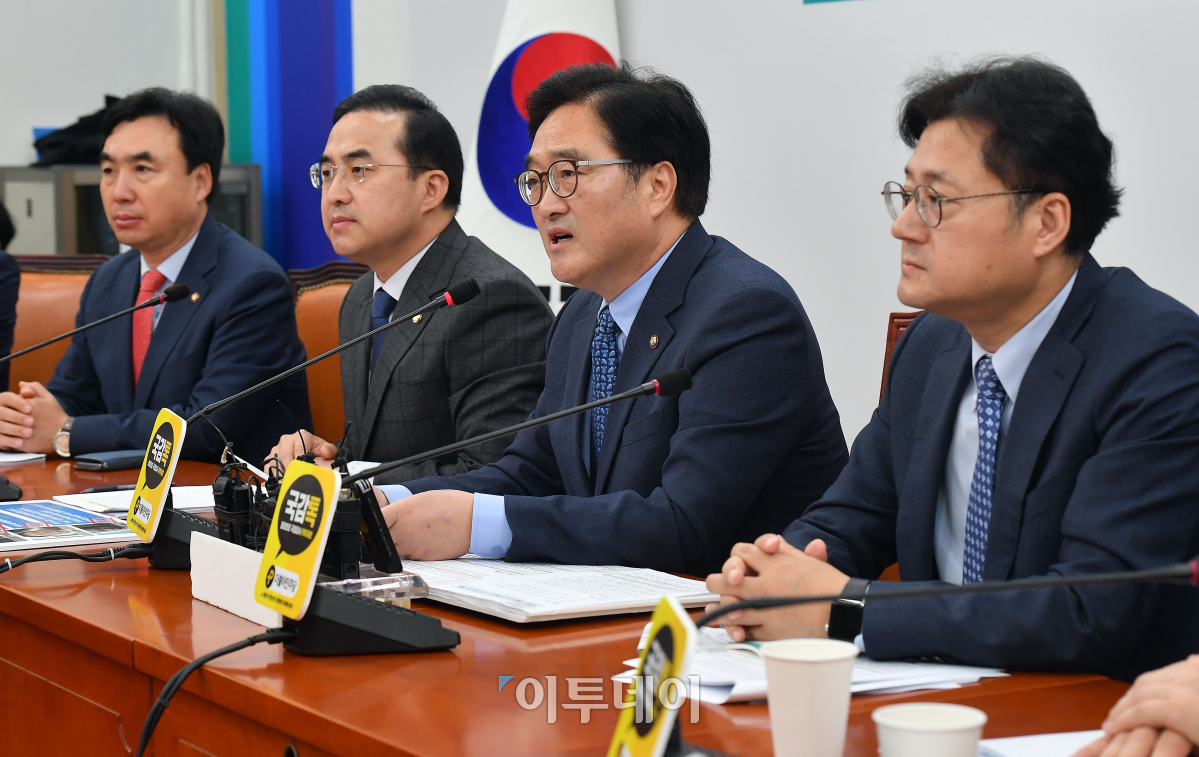 우원식(오른쪽에서 두 번째) 더불어민주당 원내대표가 16일 오전 서울 여의도 국회에서 열린 국정감사 대책회의에서 모두발언을 하고 있다. 이동근 기자 foto@