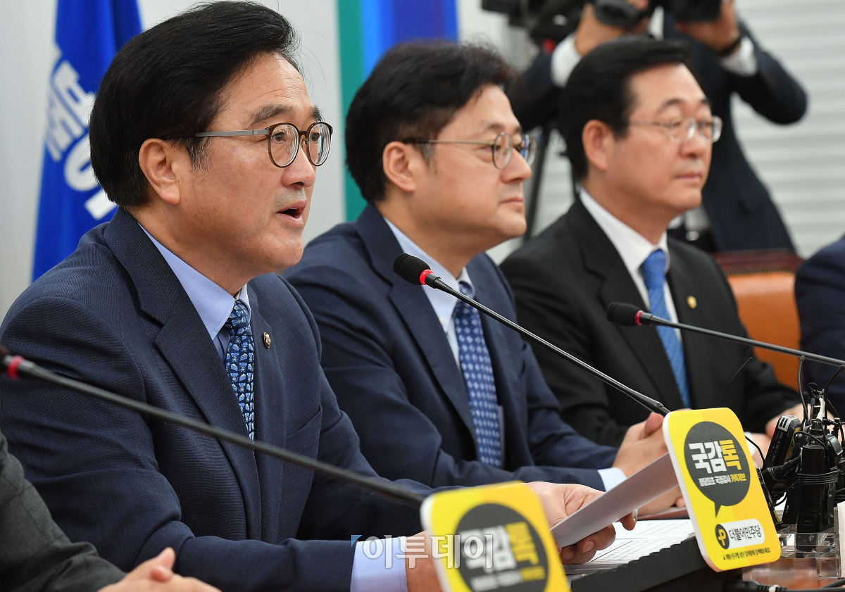 우원식 더불어민주당 원내대표가 16일 오전 서울 여의도 국회에서 열린 국정감사 대책회의에서 모두발언을 하고 있다. 이동근 기자 foto@