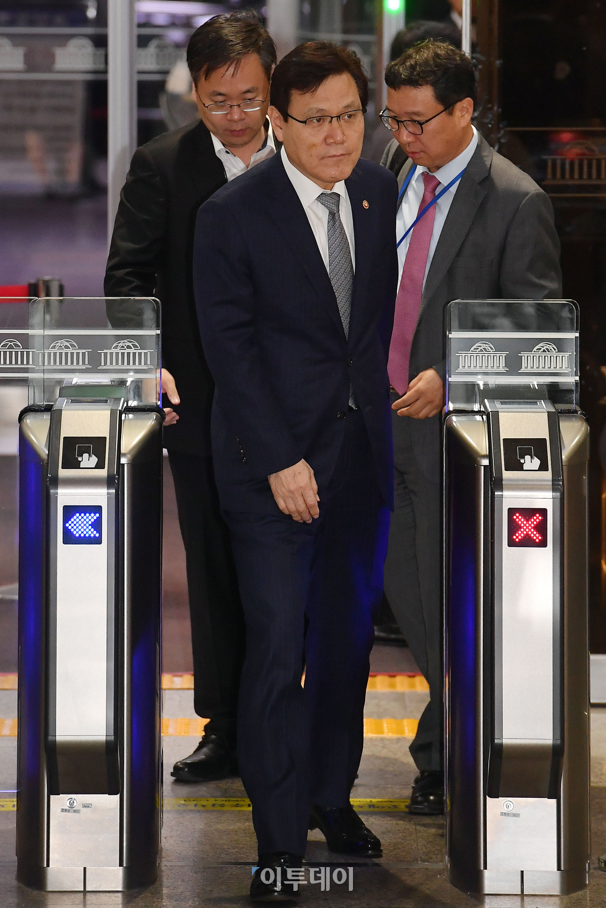 최종구 금융위원장이 16일 오전 국정감사를 앞두고 서울 여의도 국회로 들어서고 있다. 이날 금융위원회 국정감사는 삼성 이건희 회장의 차명비자금 면죄부 논란과 인터넷은행 특혜 의혹 등을 놓고 공방을 벌인다. 이동근 기자 foto@
