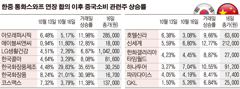 16일 유가증권시장(코스피)에서는 중국 관련 매출 영향이 큰 화장품, 여행, 면세점, 카지노 등 중국 소비 관련주가 2거래일 연속 동반 상승했다. 지난 13일 전해진 한중 통화스와프(약정된 환율에 따라 일정한 시점에서 통화를 서로 교환하는 외환거래) 협정 연장 합의 소식이 양국 간 갈등 해소의 신호탄으로 해석된 영향이다. 김동연 경제부총리도 외신과의 인터뷰에서 “중국과의 관계에서 최악의 상황은 곧 지나갈 것”이라고 말했다.