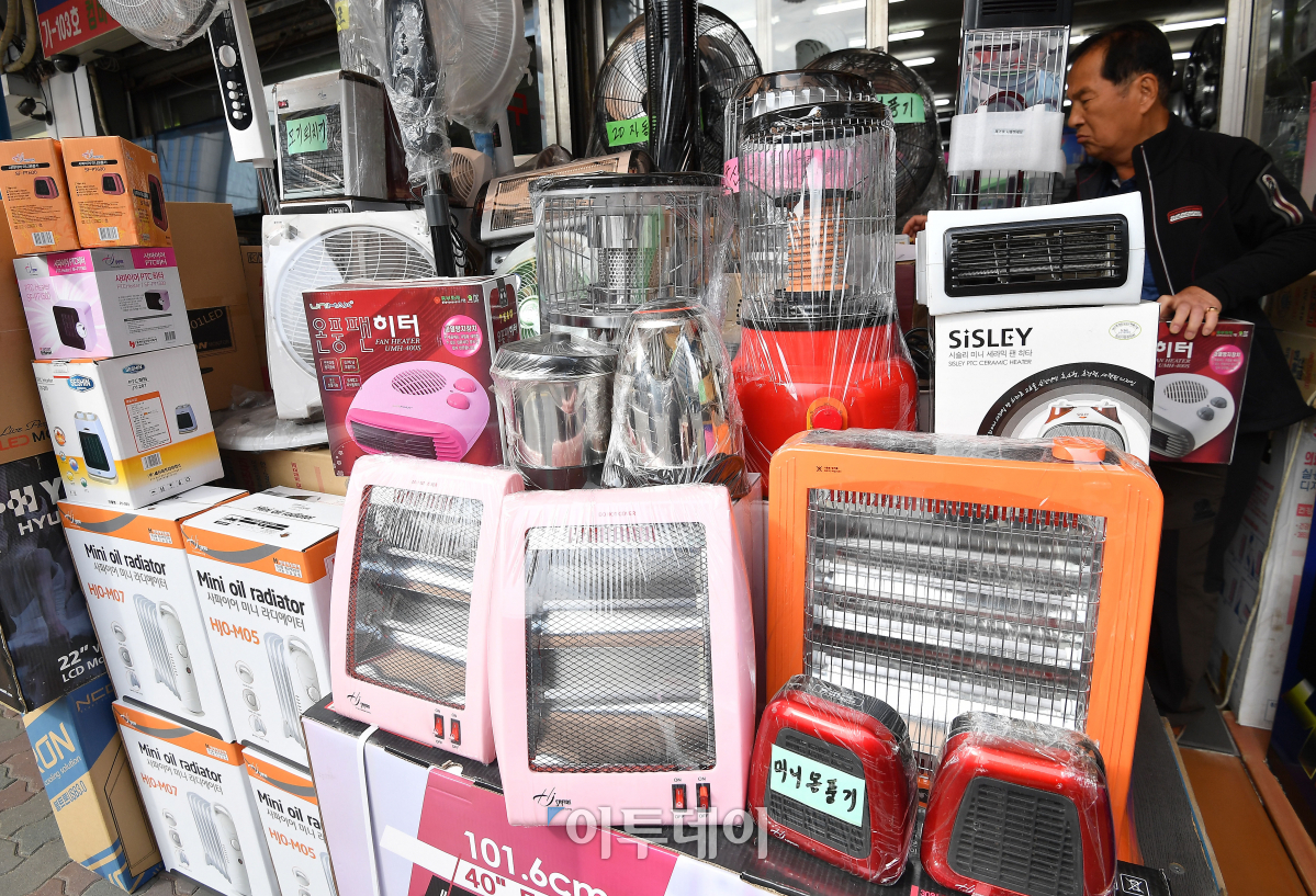 아침 저녁으로 쌀쌀한 날씨가 이어지고 있는 가운데 16일 서울 용산전자상가 가전제품 매장에서 상인이 난방용품을 진열하고 있다. 이동근 foto@