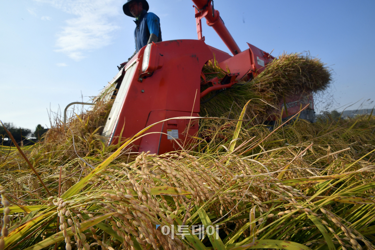 수확의 계절인 가을이 깊어지고 있다. 16일 경기 고양시 송포동 인근 논에서 한 농부가 콤바인을 이용해 추수를 하고 있다. 이동근 기자 foto@