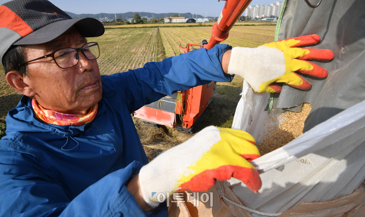 수확의 계절인 가을이 깊어지고 있다. 16일 경기 고양시 송포동 인근 논에서 한 농부가 수확한 벼 알을 포대에 담고 있다. 이동근 기자 foto@