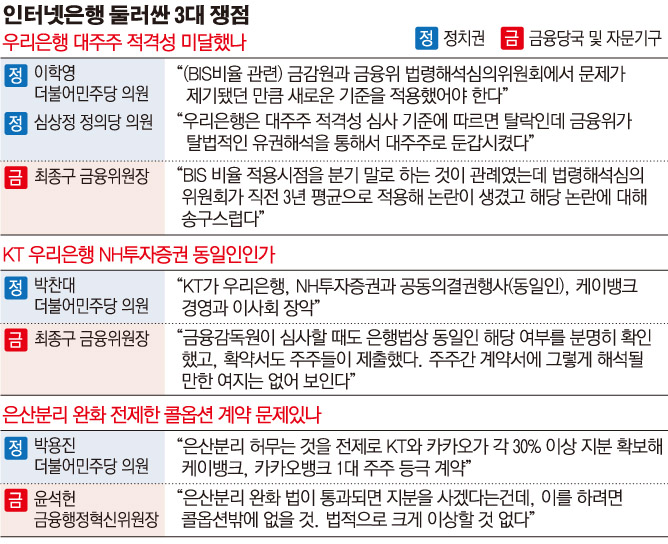 16일 국감에서는 케이뱅크 관련 △대주주(우리은행) 재무건전성 요건 미달 △주요 주주 동일인 의혹 △은산분리 무시한 콜옵션 계약 등 3대 쟁점이 문제가 됐다. 이에 대해 최종구 금융위원장은 “인가 절차상 문제는 있었지만 위법은 없었다”고 말했다. 여당 의원들의 추궁이 이어지자 “케이뱅크 인허가 과정을 재검토하겠다”고도 했다.