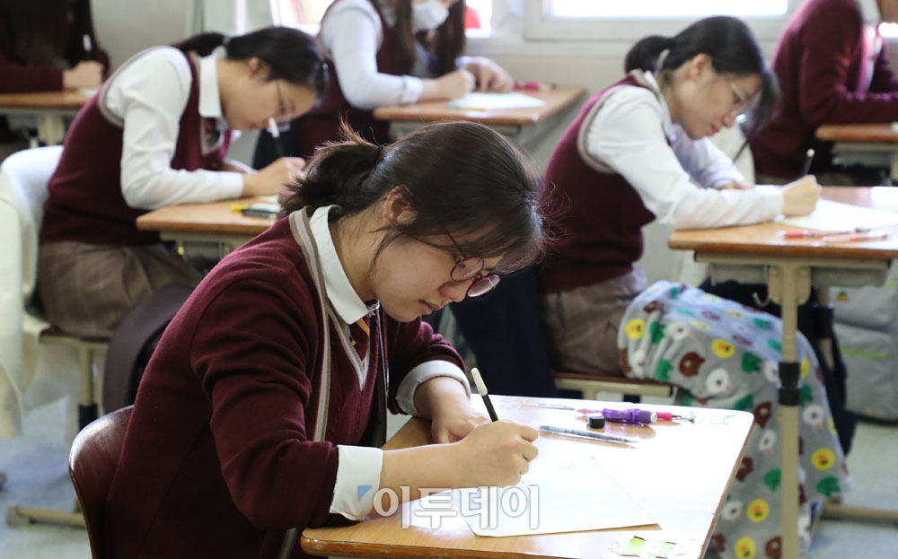 2018학년도 수능을 앞두고 마지막 전국연합학력평가가 치러진 17일 오전 서울 용산구 성심여고에서 3학년 수험생들이 시험준비를 하고 있다. 서울시교육청이 주관하는 이번 시험에는 전국 1835개 교등학교에서 약 48만 명의 3학년 학생들이 응시했으며, 한국사는 필수 응시과목이며 수학영역은 가형 또는 나형 중 선택할 수 있다. 이동근 기자 foto@